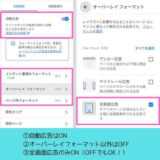 オーバーレイフォーマットのうちサイドレール広告はオフにします。モバイル端末の場合、サイドレール広告はバナー広告扱いになる場合があるため、CLSへの影響を加味してオフにしました。